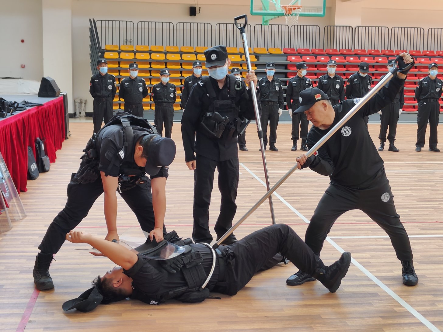 当天上午10时许,培训正式拉开序幕。刘帆教官分别从防暴盾牌的使用方法和作用、警棍的使用方法、钢叉的使用和警棍的配合、擒拿格斗的简单技巧以及“模拟不法分子冲击校园及应对措施”等各方面对队员们进行了讲解和实战演练。在培训最后阶段,刘帆教官对所有参训队员的学习情况进行了严格考核和详细讲评。刘教官认为参训队员具有一定的专业技能基础,在此次培训过程中也体现出了安保队伍的纪律性,能够严格按照要求进行学习和实战演练,同时希望全体参训队员能够时刻保持良好的学习心态和高度负责的职业精神,刻苦训练,不断提高和进步,为守护校园安全贡献自己的一份力量。