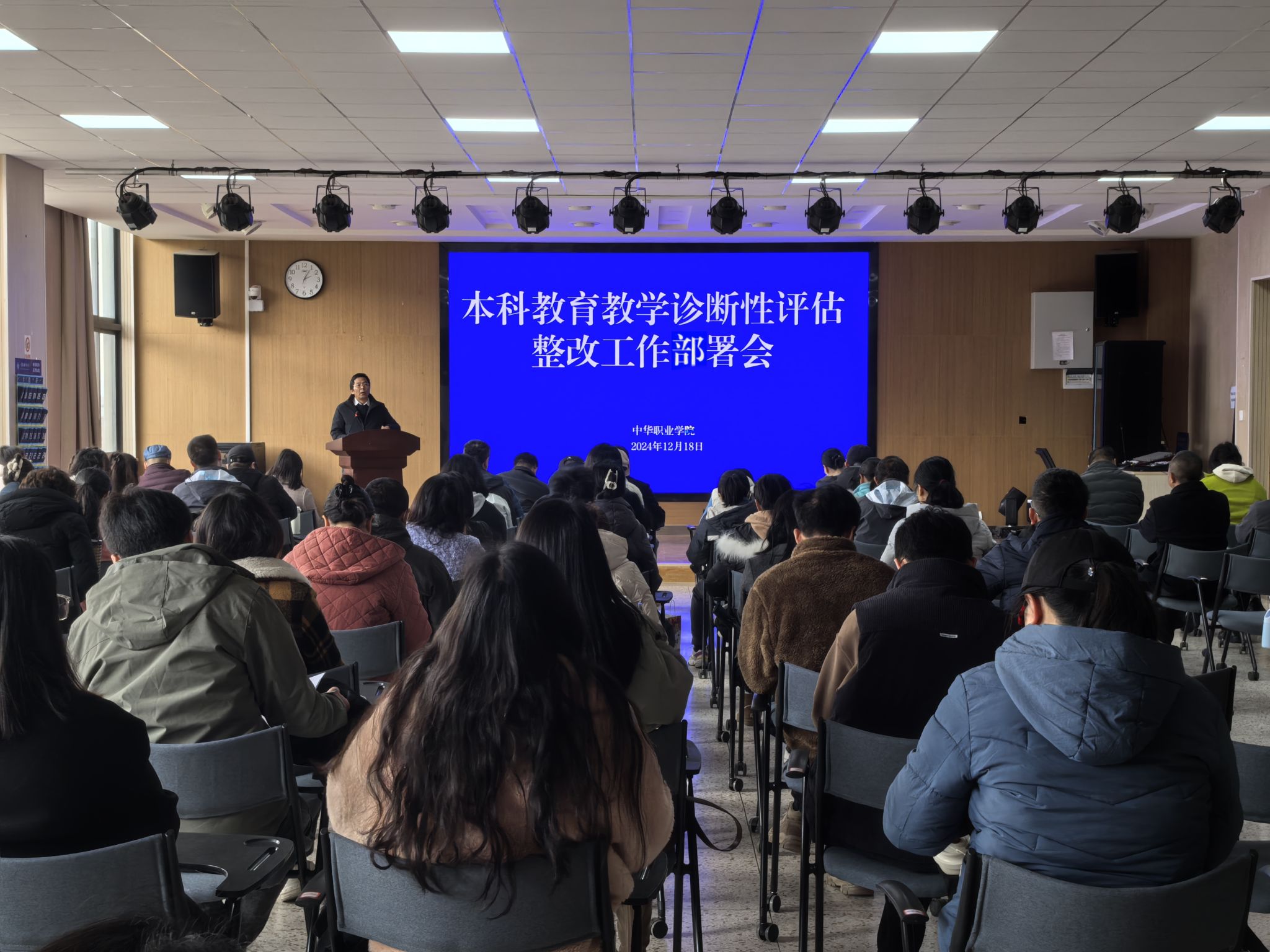 为全面推进落实学校本科教育教学诊断性评估问题整改工作,做到完善规范与强化特色相结合,12月18日下午,中华职业学院在修远楼204室召开本科教育教学诊断性评估整改工作部署会。学院全体教职工参会。