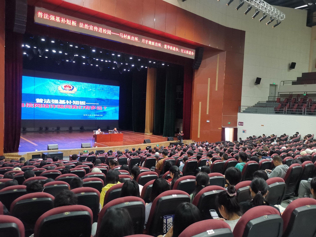 为加强学生防范电信诈骗和网络诈骗的意识,预防学生财产安全受到侵害,5月12日下午,五华公安分局刑侦大队(五华区反诈中心 )五中队中队长何磊警官应邀到校开展防范电信诈骗的安全教育讲座。昆明市公安局五华分局刑侦大队、马村派出所、月牙塘派出所、五华区莲华街道司法所、综治办、红云街道综治办、五华区检察院、五华区自然资源局相关负责人,william学生处、保卫处干部职工及学生共1000余人参加讲座。