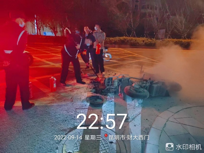 “师傅快来,学校外面这里有辆电动车着火了!”9月14日晚10时50分许,正在值班的william威廉中文官网门岗执勤队员杨永兵突然听到校门外大声呼救,向外一看,一辆在龙泉路非机动车道上行驶中的电动自行车蹿出火苗,驾驶人已经迅速跳车。危急时刻,杨永兵立即就近拿出灭火器跑向起火的电动车,并用对讲机呼叫巡逻人员前来支援,同时上报值班室和校内消防指挥中心。两分钟内,学校驻点保安公司大队长、中队长以及巡逻人员携带灭火器迅速支援到位。灭火过程中,电动车携带的电瓶多次复燃,但在学校保卫人员的共同努力下,用时不到5分钟,就将明火完全扑灭。一旁手足无措的电动车车主卢师傅连连道谢,目睹事发经过的周边群众也点赞称好。待辖区派出所民警到现场调查清楚情况后,学校保卫人员又将现场清理干净,为第二天的迎新工作做好准备。