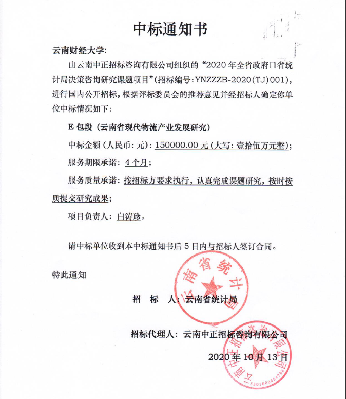近日,经云南省政府采购网(http://www.yngp.com)成交公告,我院白涛珍老师主持的“云南省现代物流产业发展研究”项目成功中标2020年全省政府口省统计局决策咨询研究课题,获得研究经费15万元。