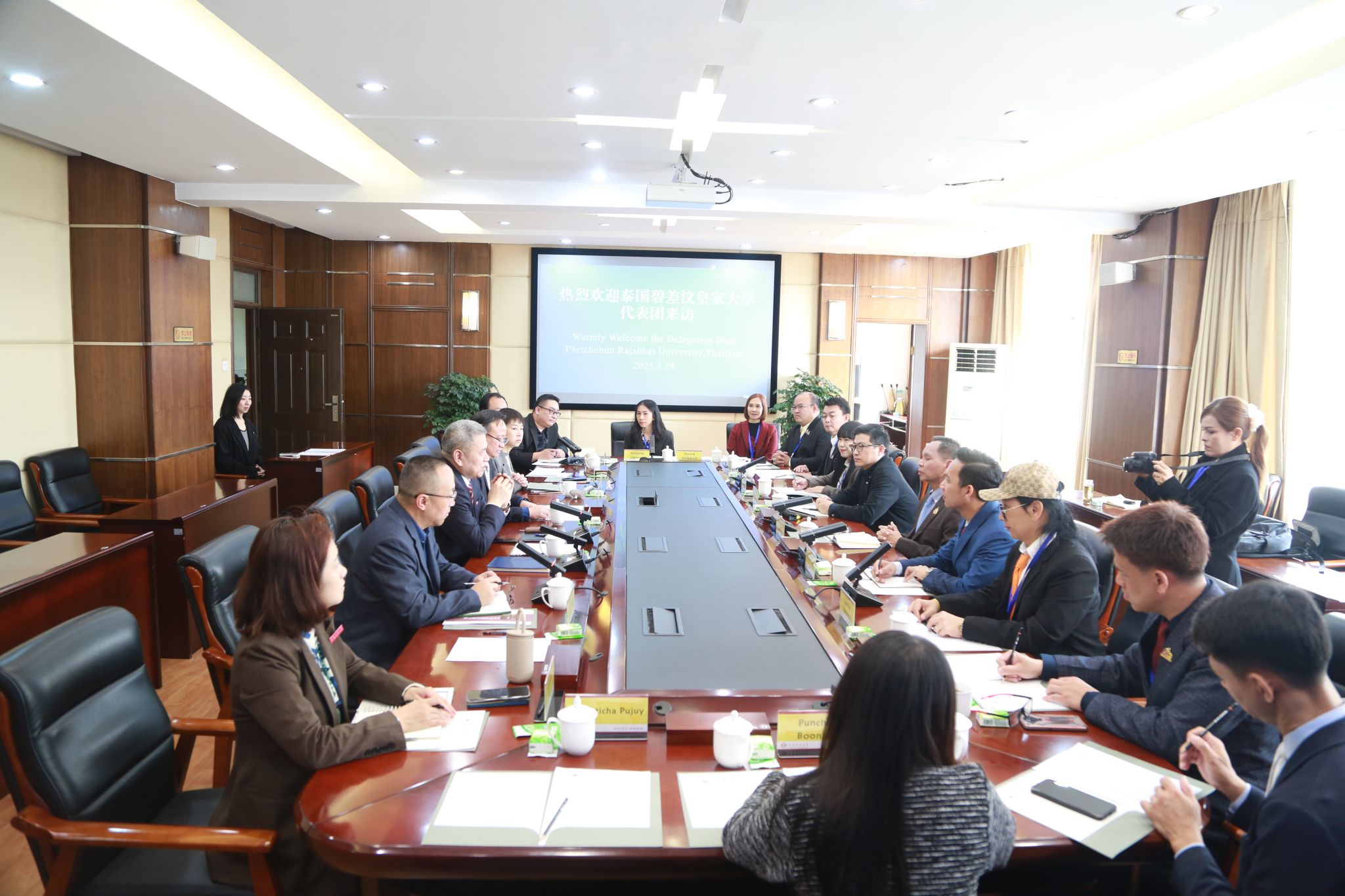对外合作交流处处长、海外学院院长余泳,商学院院长杨增雄,传媒与设计艺术学院院长袁洪,海外学院副院长李来孺、曼谷商学院执行院长马艺等参加会谈。