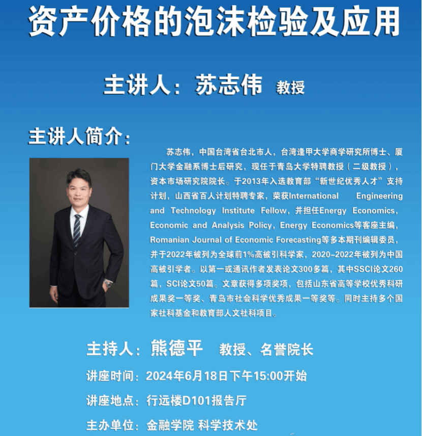 Prof. Su Zhiwei is from Taipei, Taiwan. He holds a Ph.D. from the Graduate Institute of Business at Feng Chia University and has completed postdoctoral research in the Department of Finance at Xiamen University. He is currently a Distinguished Professor (Second Level) at Qingdao University and the Dean of the Capital Market Research Institute. In 2013, he was selected for the Ministry of Education’s “New Century Excellent Talent” support program and is a specially appointed expert under the Shanxi Province “Hundred Talents Program”. He is a fellow of the International Engineering and Technology Institute and serves as a guest editor for journals such as Energy Economics and Economic and Analysis Policy. He is also on the editorial boards of several journals, including the Romanian Journal of Economic Forecasting. In 2022, he was listed as one of the world's top 1% highly cited scientists, and from 2020 to 2022, he was recognized as a highly cited scholar in China.