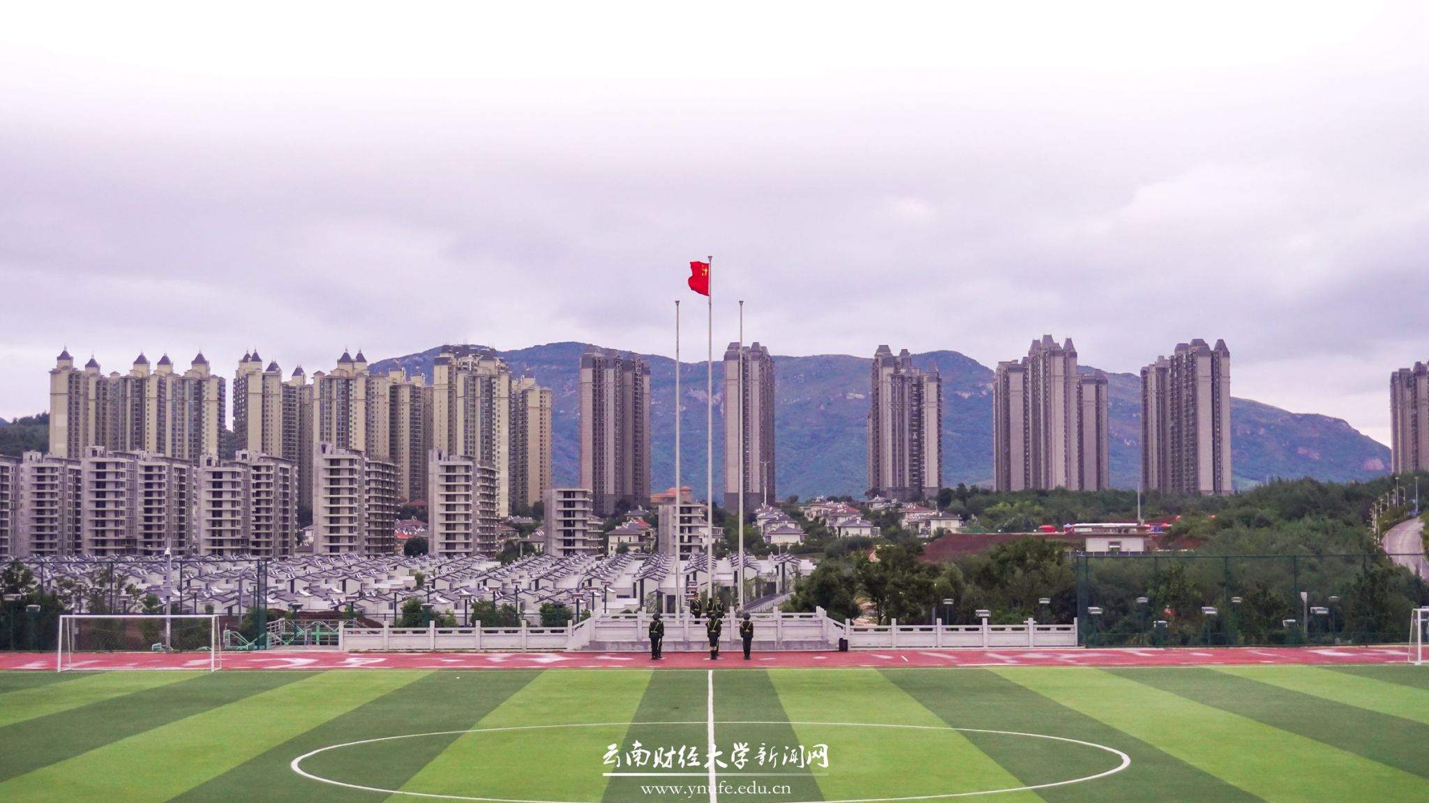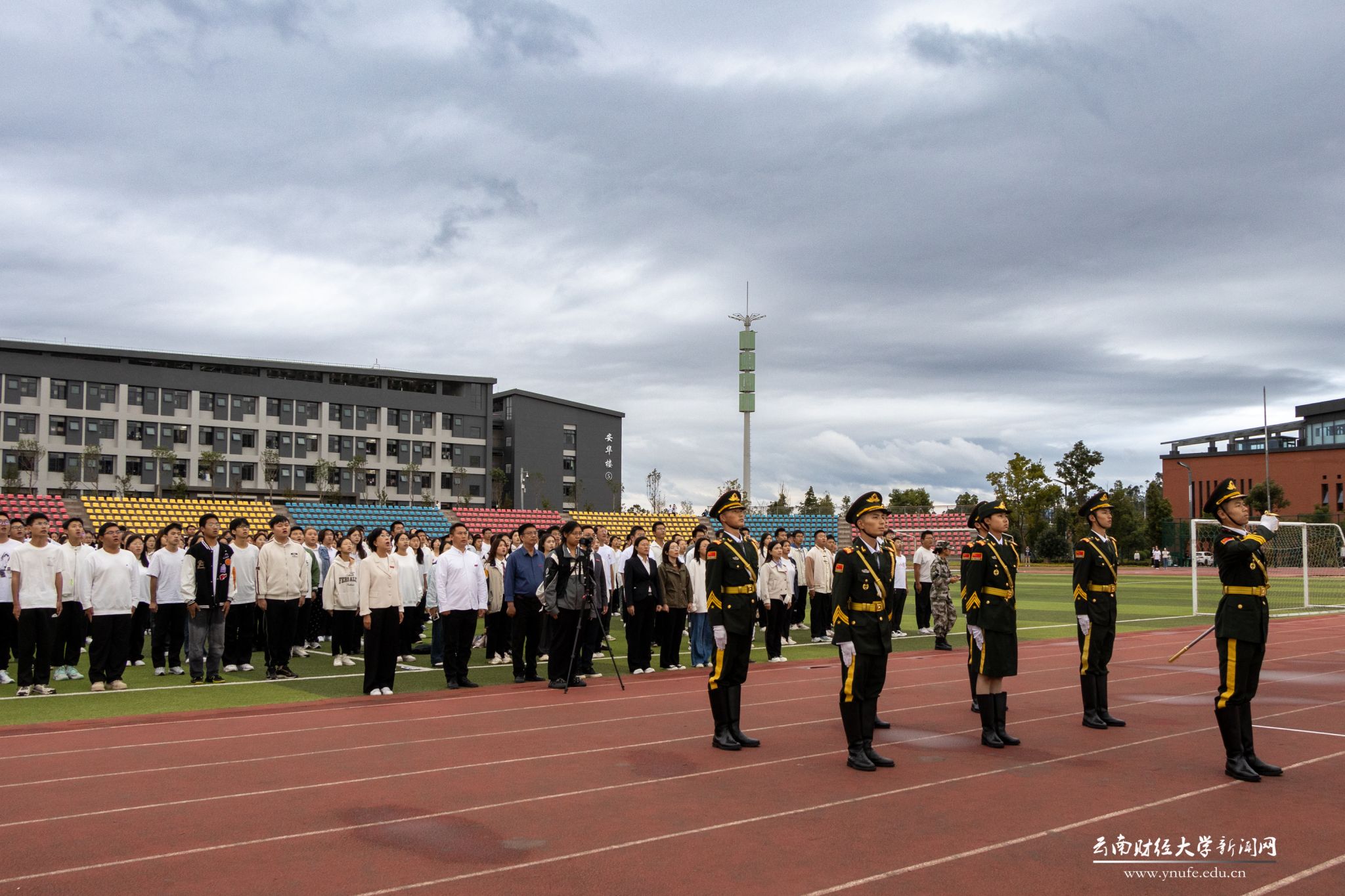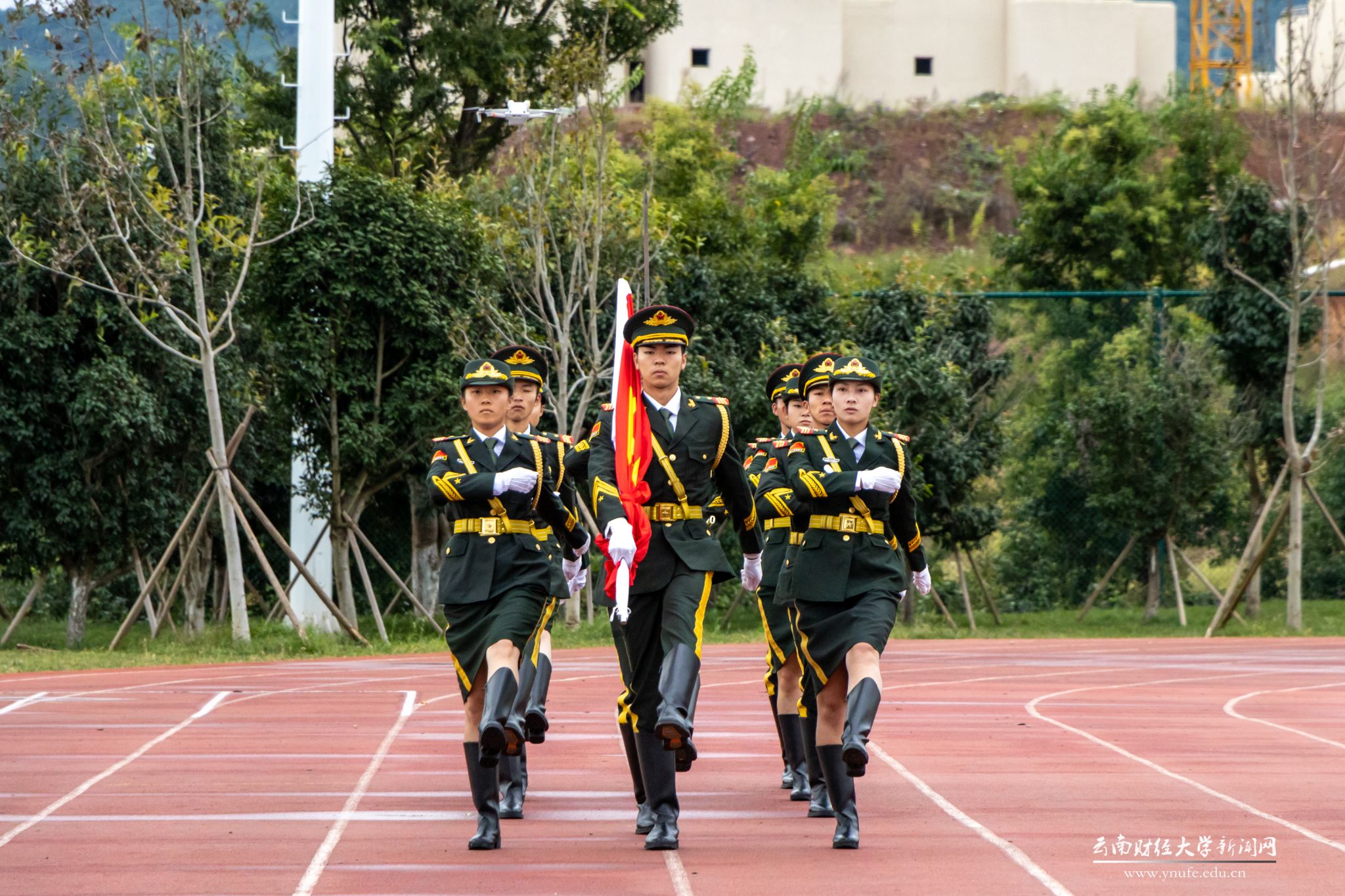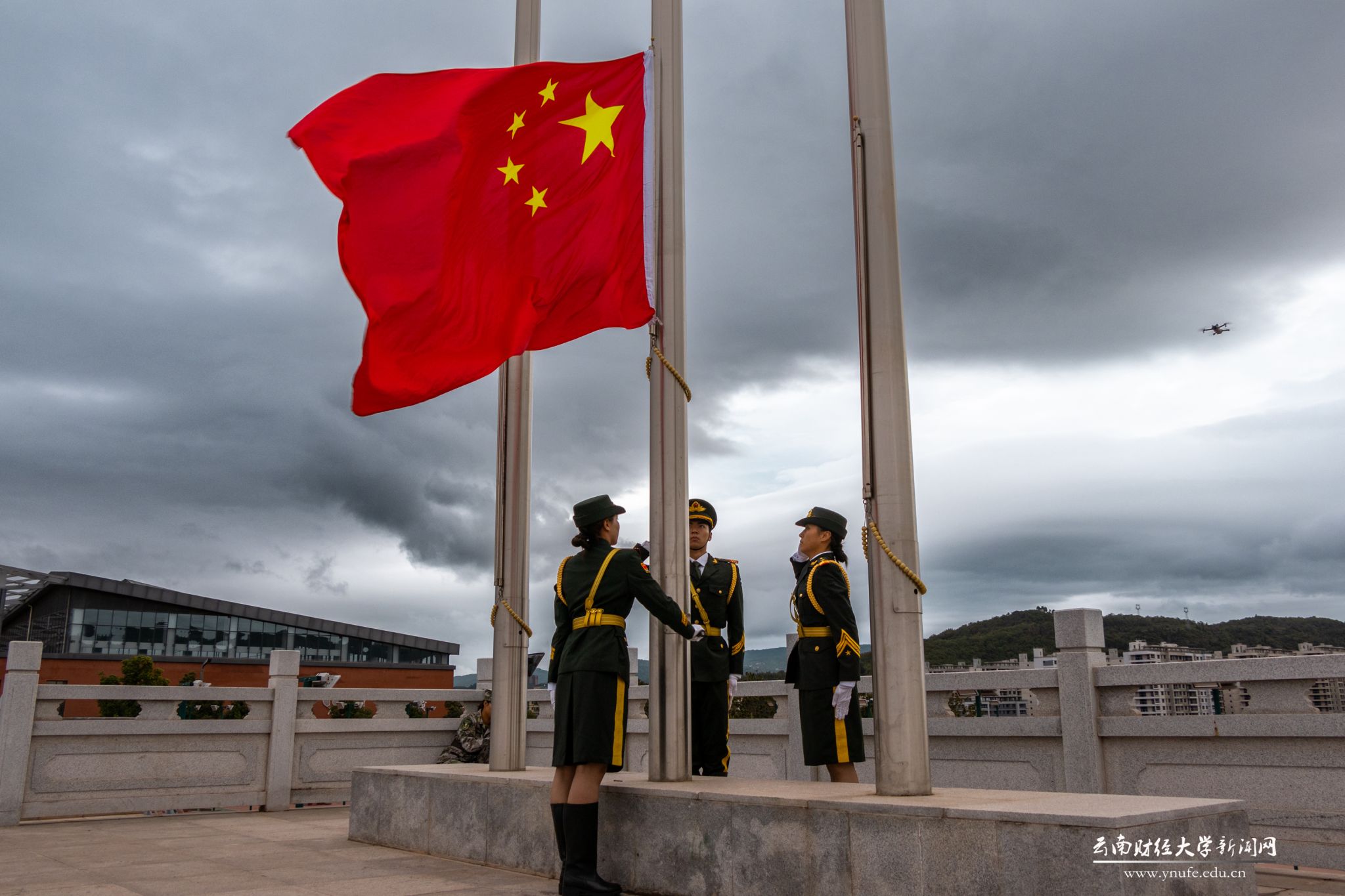 History witnesses the magnificent journey, and time engraves the footprints of struggle. On October 1, 2024, to celebrate the 75th anniversary of the founding of the People's Republic of China, Yunnan University of Finance and Economics held flag-raising ceremonies simultaneously at both Longquan Road campus and Anning campus. University leaders and over 2,000 faculty and student representatives participated.