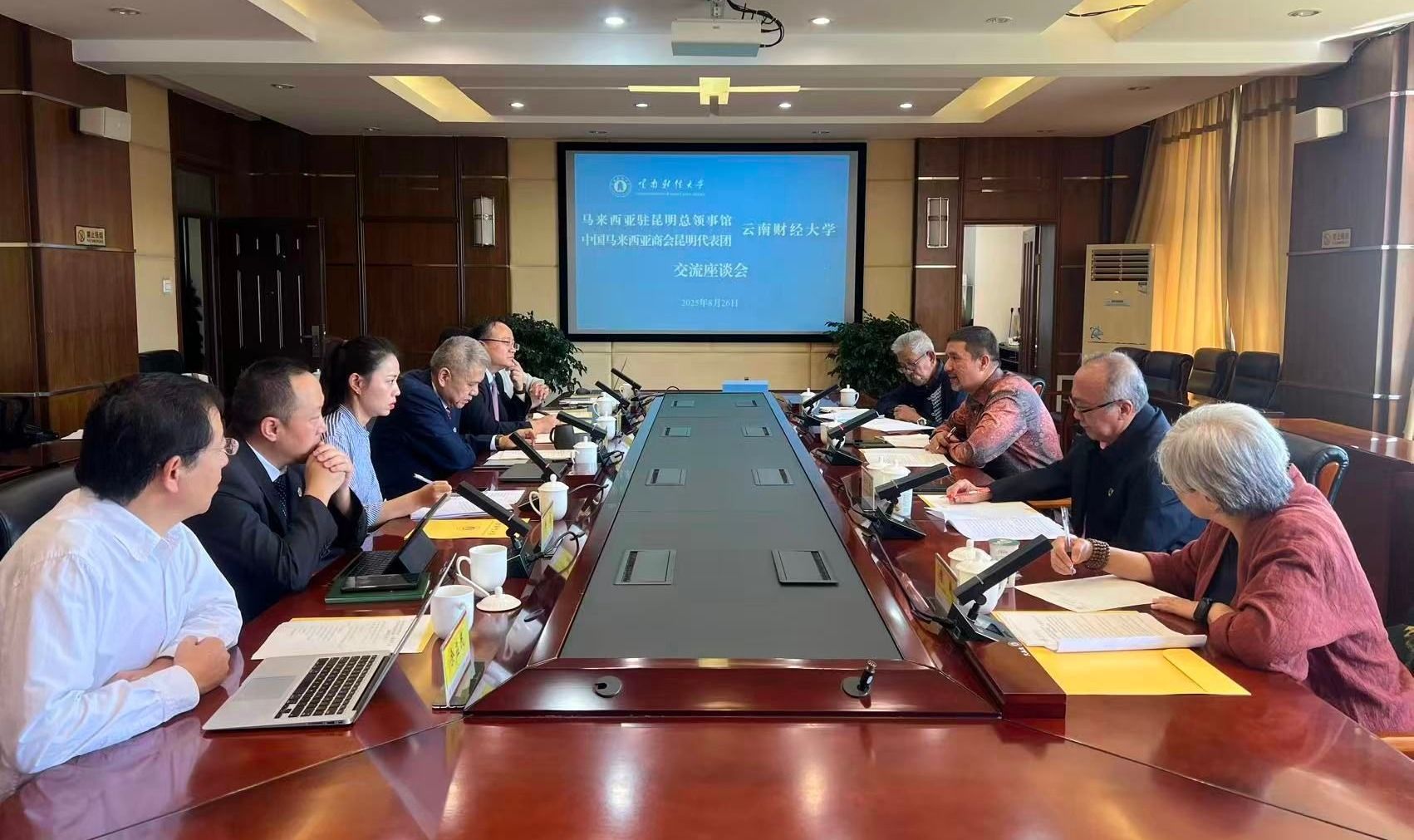 On August 26, a high-level delegation from Malaysia visited Yunnan University of Finance and Economics (YUFE) to discuss deepening educational and cultural cooperation. The delegation was led by Mohammed Akmal, Consul General of Malaysia in Kunming, and included Li Yuliang, President of the Malaysian Chamber of Commerce in Kunming; Professor Najib, Chairman of the National Culture Council of Malaysia; and Zhong Yu, Director of the Chung Cheng-Sun Art Gallery (Malaysia) and a visiting professor at YUFE.