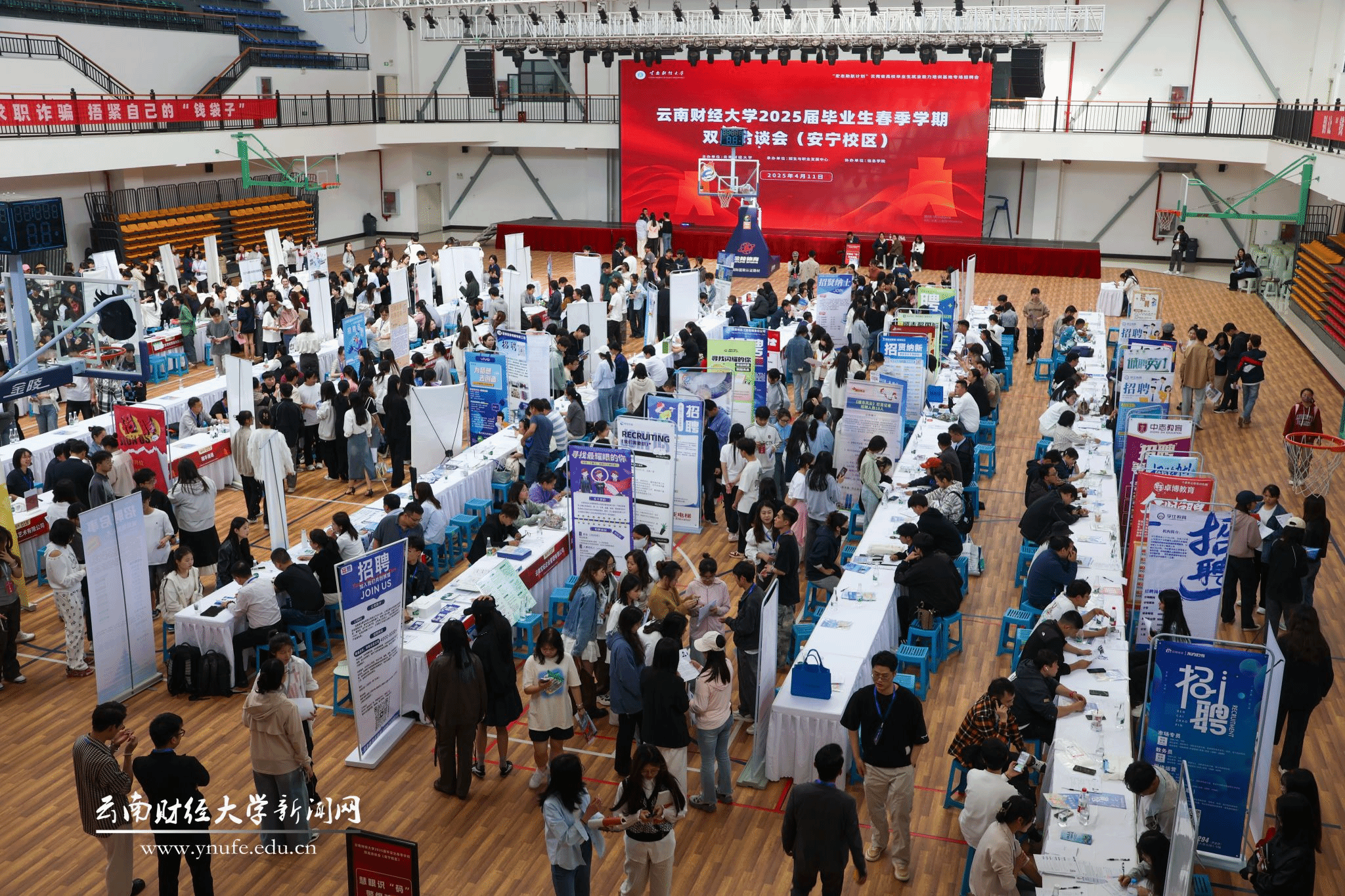 为切实做好毕业生就业工作,搭建好用人单位与毕业生之间双向选择平台,促进毕业生高质量充分就业,4月11日,william威廉中文官网在安宁校区举办2025届毕业生春季学期首场双选洽谈会。153家用人单位现场开展招聘,提供岗位413个,招聘需求人数3600余人,近2000学生参加现场招聘并进行简历投递。此次双选会由招生与职业发展中心主办,信息学院承办。