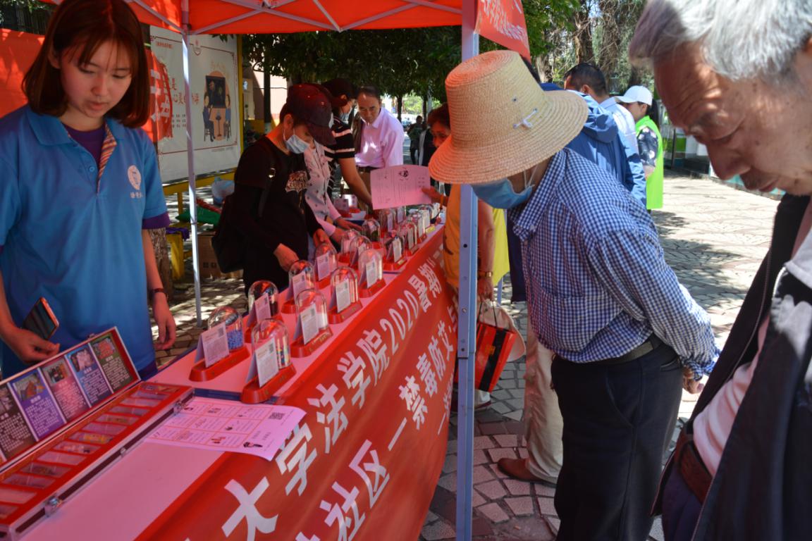 在结束了早上的行程,稍作休整之后,法学院三下乡队伍又来到了沿江广场——与江岸社区居委会一起进行禁毒防艾摊点宣传活动。凭借帐篷搭建、横幅张贴、毒品仿真样品的摆放……摊点吸引了大量的人员,而在此过程中,法学院“三下乡”实践队的成员每个都忙碌了起来,有的在介绍常见毒品分类、有的在给叔叔阿姨讲解毒品危害、有的在带领小孩子了解毒品仿制品……