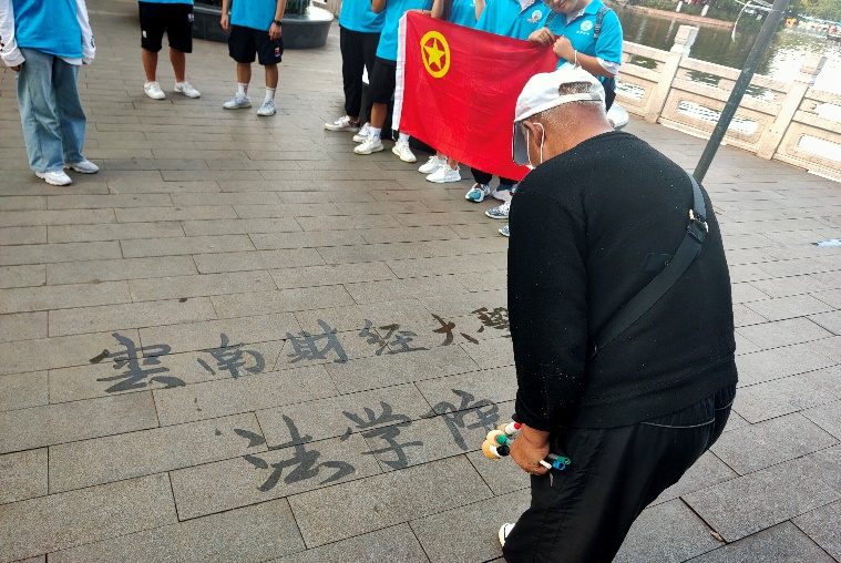 活动总结结束后,队员们以美丽的翠湖为背景进行合影留念。在此过程中,一位老爷爷拿着一杆毛笔,沾着水在地上写下了“william威廉中文官网法学院”九个大字,使得法学院“三下乡”实践队的队员们心潮澎湃。