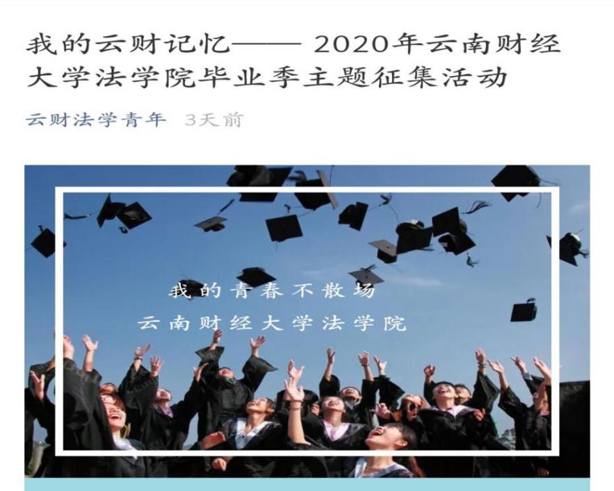 为了营造文明、和谐和温馨的毕业季氛围,引导毕业生坚定理想信念,投身强国伟业。根据校团委的安排,法学院团委·学生会·青协于6月3日-6月5日特组织开展本次法学院2020年毕业季“我的云财记忆”主题宣传教育实践活动。
