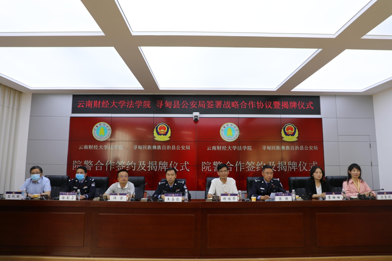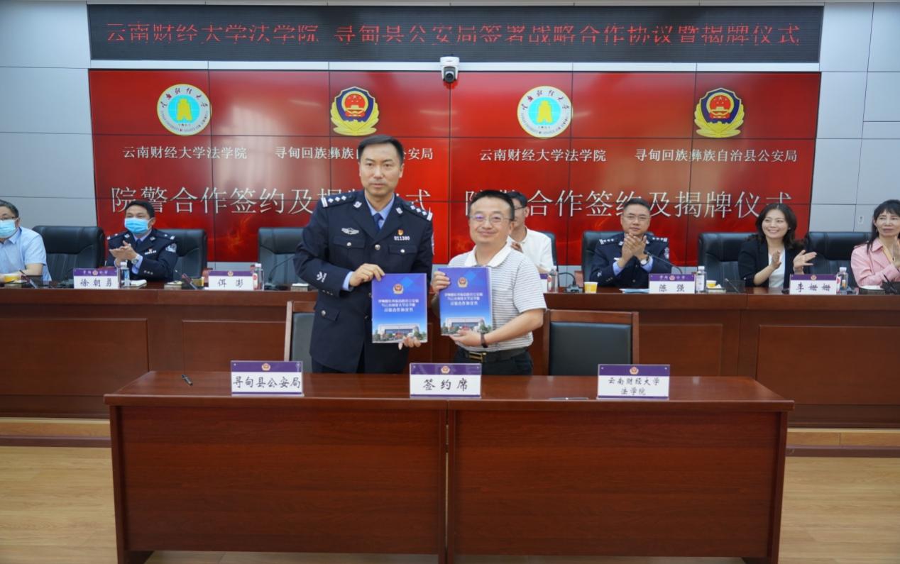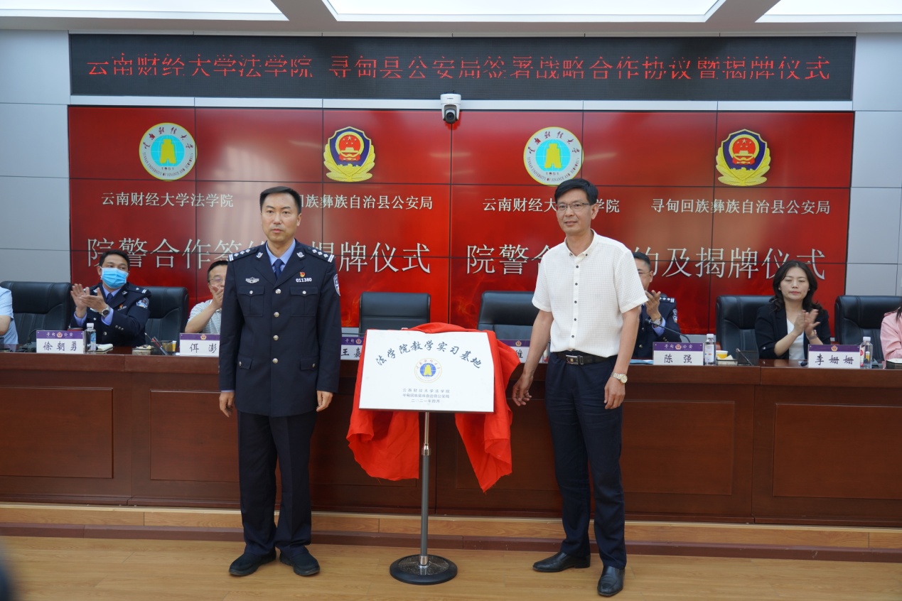 为进一步贯彻落实习近平新时代中国特色社会主义思想和十九届五中全会精神,不断推进依法治国、人才强校,努力探索法学教育教学实践研究,4月16日,william法学院与寻甸县公安局建立法学院教学实习基地战略协议签订及揭牌仪式在寻甸县公安局举行。学院党委书记谢维华、院长佴澎、党委副书记兼纪委书记李姗姗、副院长马慧娟、石现明与寻甸副县长、县公安局党委书记、局长王嘉懿、政委陈强及县公安局党委班子成员、直属各部门全体干警等130余人一同参加。