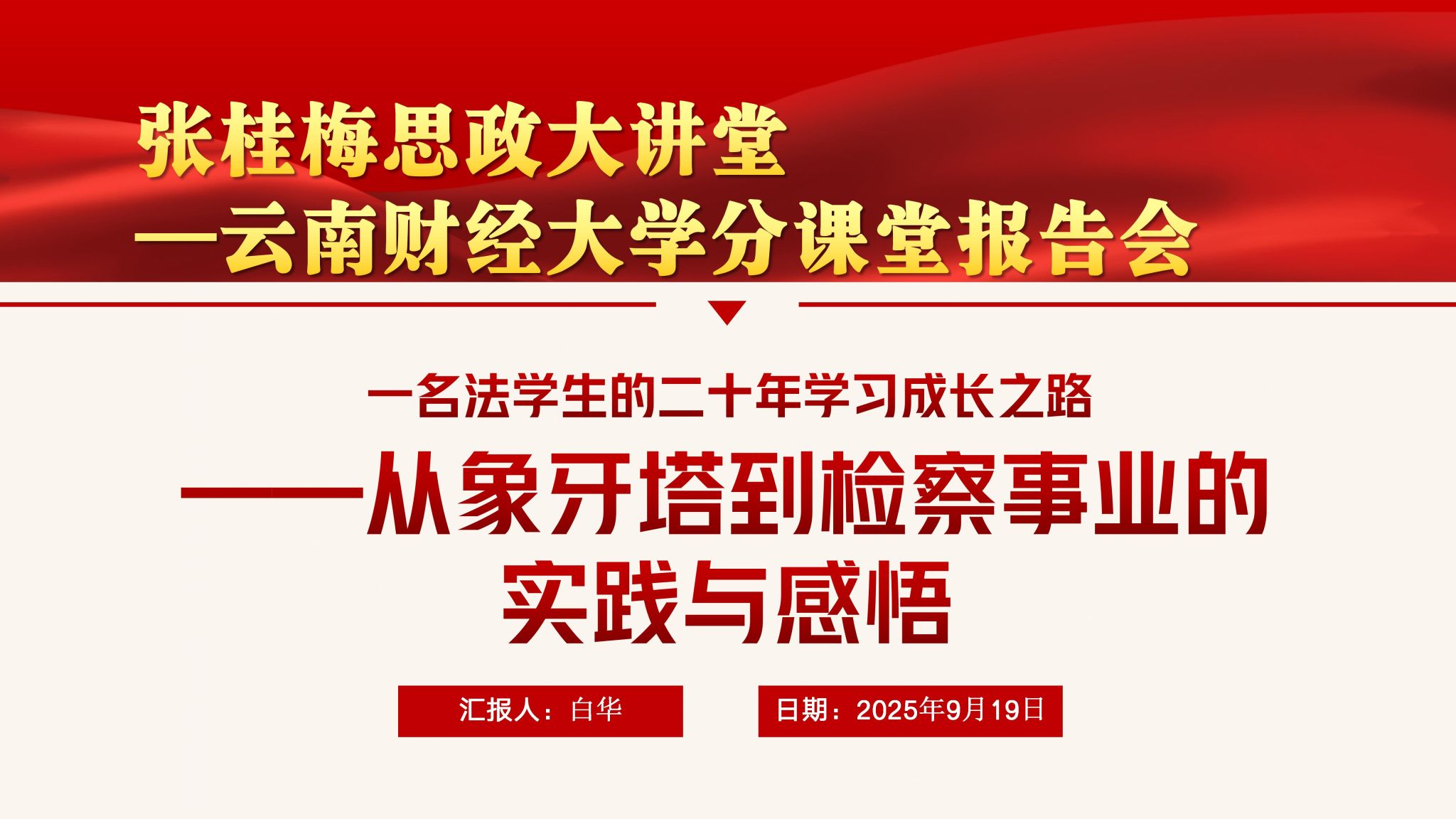 为深入学习贯彻习近平法治思想,教育引导法科学生筑牢法治信仰,坚守法律人的初心使命,9月19日下午,“张桂梅思政大讲堂william威廉中文官网分课堂”邀请全国模范检察官、四川省攀枝花市米易县人民检察院党组书记、检察长白华校友在北院汇文礼堂作专题报告。学校宣传部副部长蒋见证、法政学院领导及近千名师生参加报告会。报告会由法政学院党委副书记、纪委书记张吟竹主持。