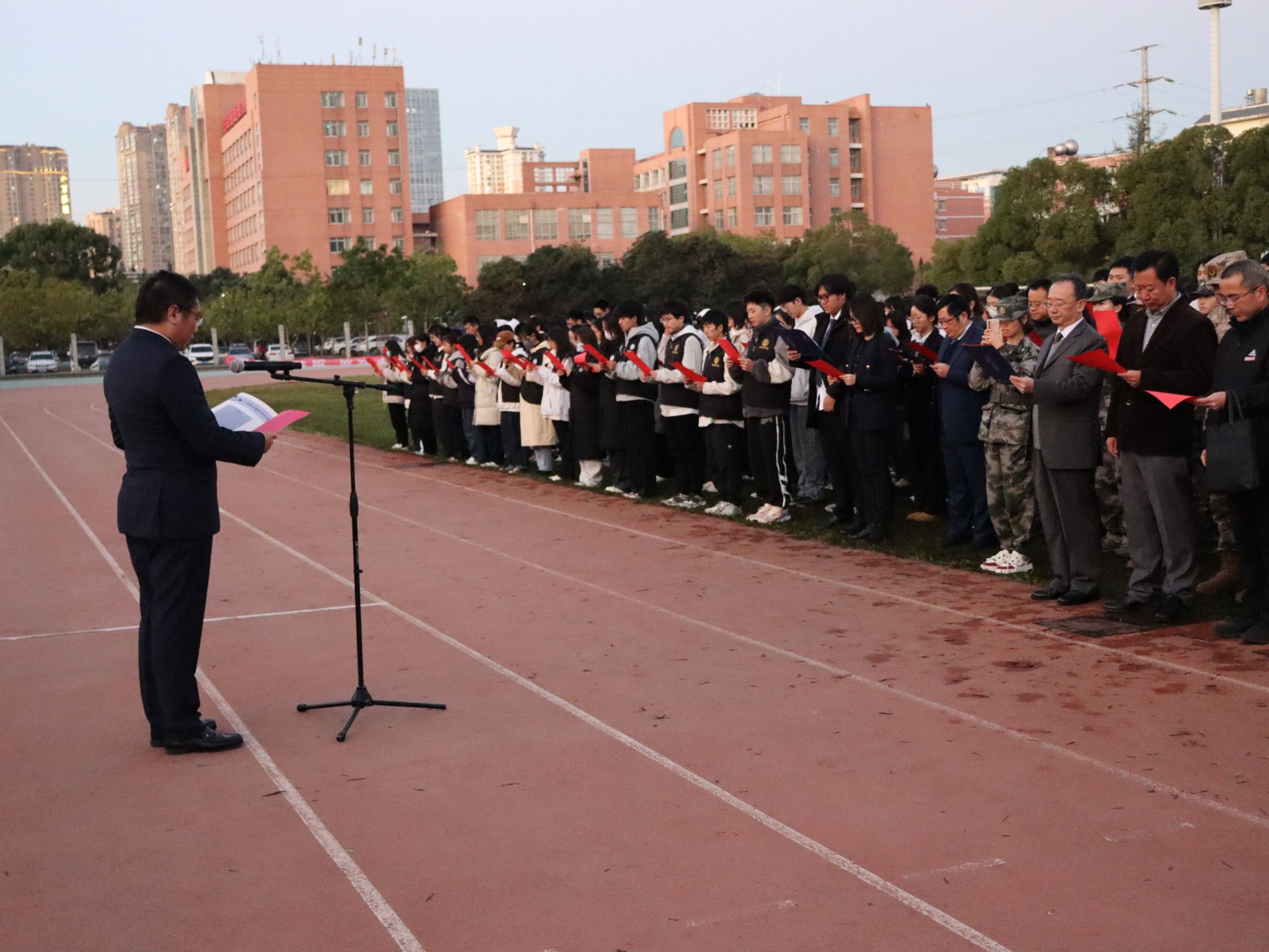 校党委委员、纪委书记、监察专员业光远带领全场师生诵读宪法序言摘录。洪亮的诵读声响彻体育场,激发了全体师生对宪法的崇敬、对法治的信仰。