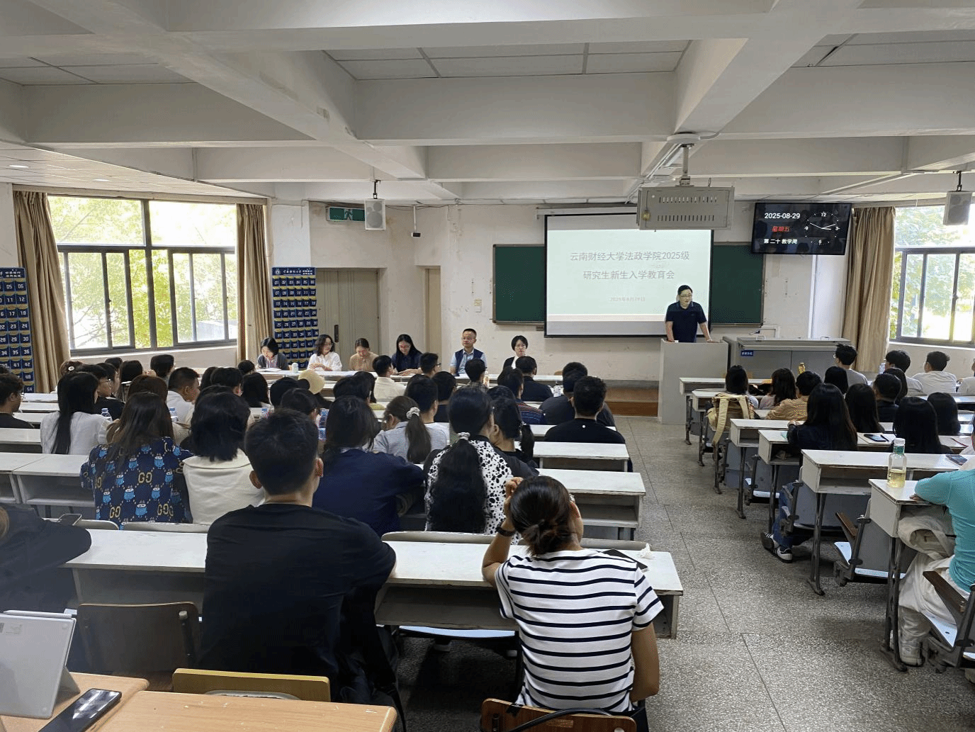 8月29日,法政学院组织开展2025级研究生新生入学教育。学院领导以及研究生全体新生班主任参加,入学教育由研究生科科长杨艳主持。石现明院长为新生系统介绍了专业培养方案、课程体系、就业前景及科研方向,帮助新生建立专业认知,明确学习目标;简琨益副院长着重强调了学院学位论文管理要求,并分享了如何进行科学研究的方法;张吟竹副书记解读了学校的各项规章制度以及学院研究生日常行为管理的要求,勉励同学们珍惜时光、勤奋学习,积极拓展创新实践能力,收获成长。
