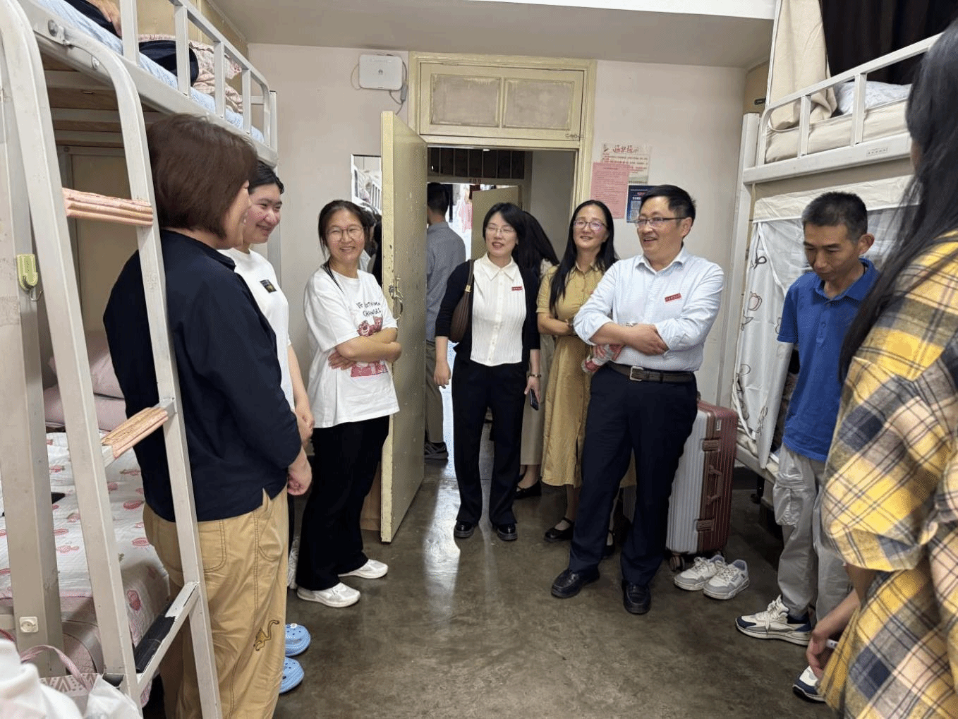 家长见面会结束后,学院领导、辅导员、班主任一起到新生宿舍走访看望2025级新生,鼓励新生们珍惜大学时光,勤奋学习,全面发展。在新的环境中积极进取、互帮互助,尽快融入法政学院这个大家庭。消除初入校园的陌生感,增强对学院的归属感。
