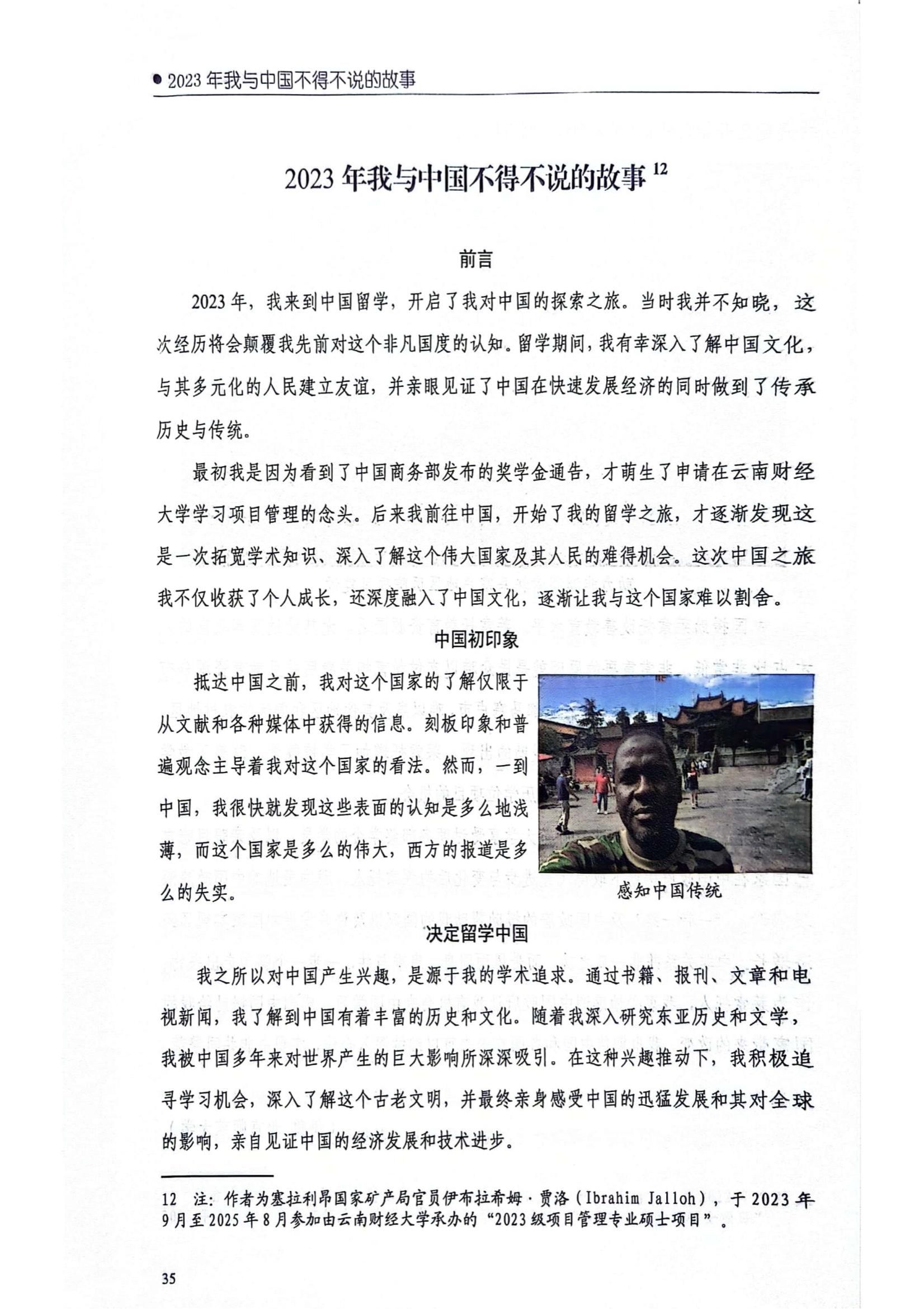 IBRAHIM JALLOH(中文名:伊布拉希姆 贾洛)为塞拉利昂国家矿产局官员,于2023年参加william承办的商务部援外学历学位教育项目。在文中,他从决定来华学习、在华的学习生涯、生活中面临的挑战、文化融入、观念变迁等方面详实记录各阶段对中国的认知及观念的转变。“经过深入了解,我发现我对中国的认知已发生了根本性的转变。中国对我来说曾经是一个陌生、奇异的国度,现在却变得熟悉而迷人。我以前对中国抱有单纯的偏见,现在却对其丰富的历史、充满活力的文化、非凡的成就有了深入地了解。中国是一个由传统习俗、现代元素和充满活力的文明构成的多面体,并在不断发展进步。”“我深深地感谢中国商务部和william威廉中文官网,让我有机会亲身体验中国。我期待在未来的岁月里继续深入了解中国。”