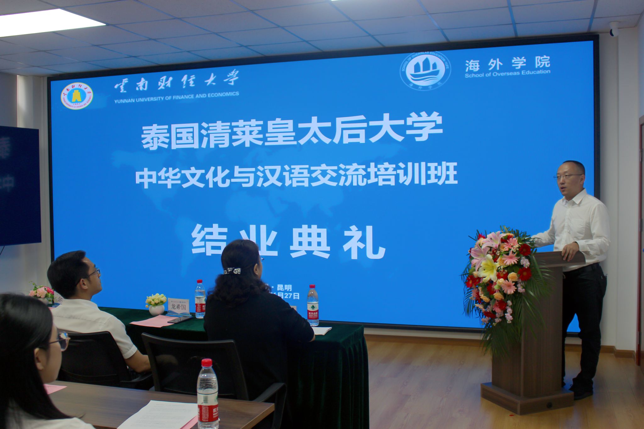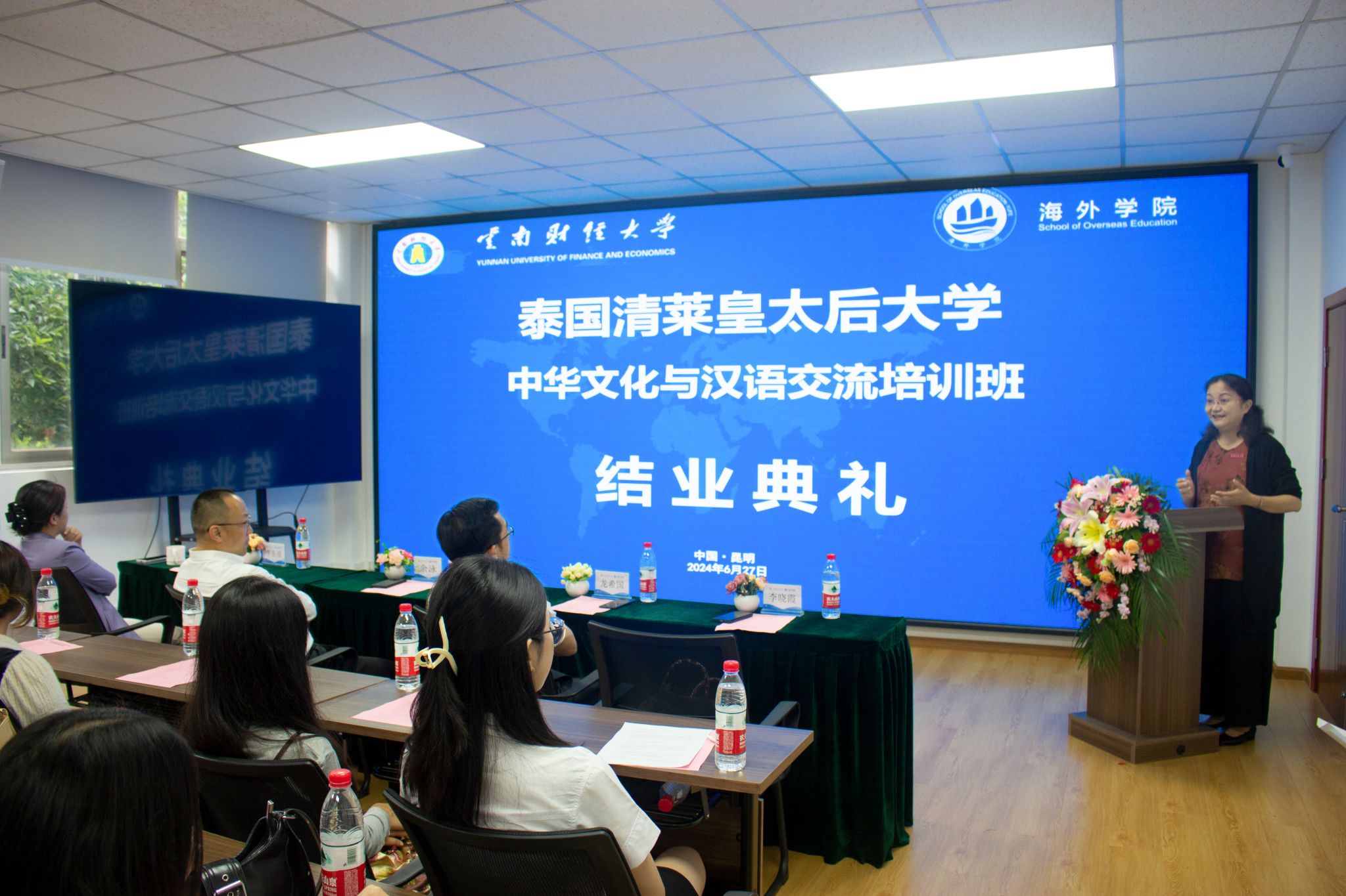2024年6月27日,泰国清莱皇太后大学中华文化与汉语交流培训班结业典礼在景贤楼201举行,宣传部副部长李晓霞,对外合作交流处处长、海外学院院长余泳,海外学院党支部书记龙希国,海外学院副院长李来孺出席典礼。