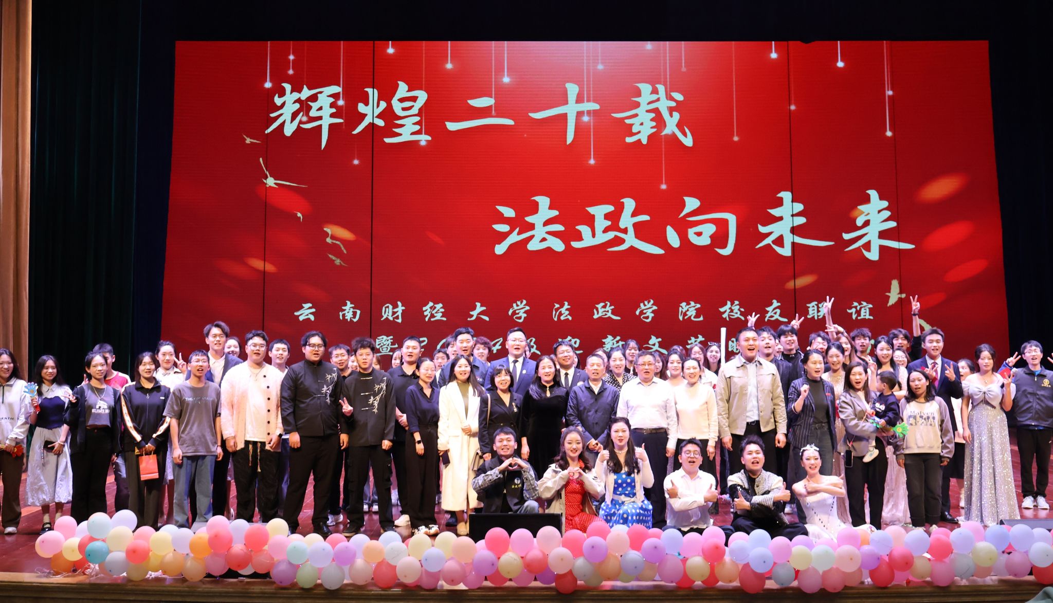 晚上7点,法政学院在北院汇文礼堂举办“辉煌二十载 法政向未来”校友联谊暨2024迎新文艺晚会,校友和在校学生同台献艺联欢。