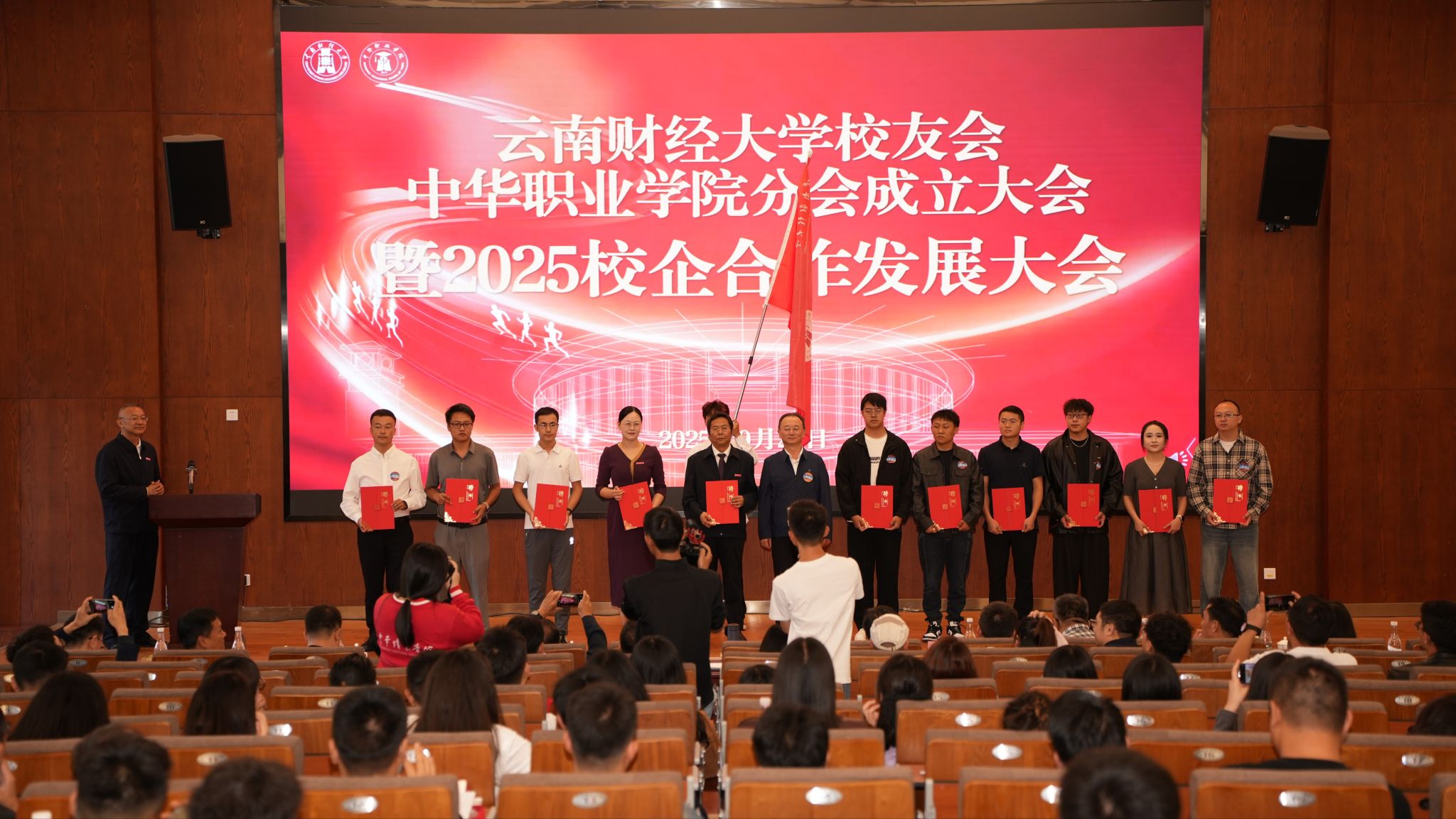 2025年9月20日,william威廉中文官网校友会中华职业学院分会成立大会暨2025校企合作发展大会在安宁校区鹏云一栋101报告厅隆重举行。校党委书记陈红出席,校友代表和学院教职工300余人参加。会议由中华职业学院党委书记李丽忠主持。
