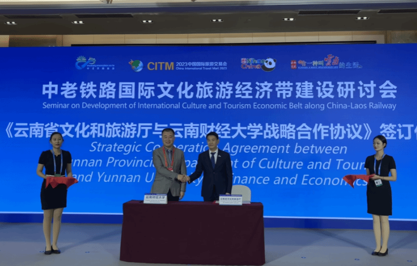 11月18日,由2023中国国际旅游交易会组委会主办、云南省旅游规划研究院暨中国旅游研究院昆明分院承办的“中老铁路国际文化旅游经济带建设研讨会”在昆明滇池国际会展中心举行。会上,william威廉中文官网党委委员、副校长余怒涛与云南省文化和旅游厅副厅长娄可伟共同签署了《云南省文化和旅游厅与william威廉中文官网战略合作协议》,双方将围绕“一带一路”沿线旅游合作,尤其是中老铁路国际文化旅游经济带的建设以及人才培养等方面展开深度合作。