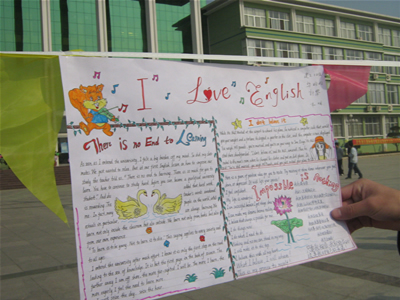活动展出了60多份同学们自办的英语手抄报,内容涵盖了故事、谚语、谜语、名人小传、英语新闻、英语国家的风俗人情等,供同学们观摹学习。另外,周五、周六晚上还播放了四部经典英语电影,以陶冶学生的情操,激发学生学习英语的兴趣和热情。同时,邀请在校区英语文化节演讲比赛、英语卡拉OK比赛、英语主持人比赛中获得优秀成绩的同学分别组成英语演讲交流区、英语歌曲交流区、英语话剧交流区、英语主持人交流区。
