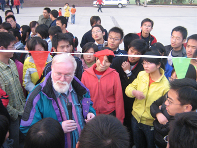 在活动现场,广场两侧道路悬挂的五颜六色的气球吸引了许多同学。气球上粘贴有用英语书写的简单西方文化问答题纸,包括猜谜语、拼词、脑筋急转弯等,当场答对者可以到主席台兑奖。