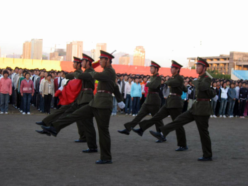 早上6时,4500多名新生同学整队来到运动场,等待这一庄严时刻的到来。6时20分,升旗仪式正式开始,担任此次升旗任务的国旗护卫队的六名同学步伐整齐,军容严整,伴随着雄壮豪迈的国歌将鲜艳的五星红旗徐徐升起。