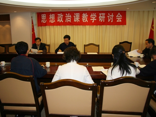 会议主要围绕五个议题展开:如何提高课堂教学效果,在教学方式和方法上使思想政治课更加贴近学生生活实际,符合学生需要;如何改进思想政治课的考核方式;如何提高教师整体素质,搞好教学创新;如何处理好思想政治课中理论教学与实践教学的关系;如何加强思想政治课的精品课程建设等。人文与社会科学学院的赵成文副院长、陈国庆副院长、教务处刘继明处长、马洪洲副处长、团委书记陈伟、学生处沈文青处长、人事处阎传海副处长就这些议题先后作了发言,并针对如何克服思想政治课教学中普遍存在的师资不足、教学资源匮乏、考试方法单一、经费不足等问题提出了宝贵建议。