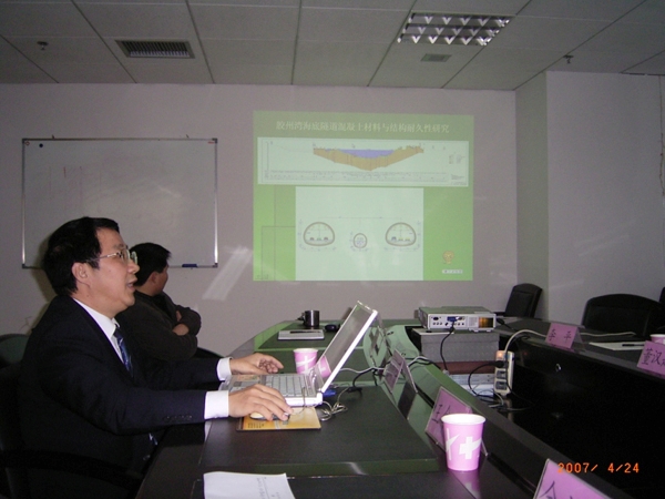 赵铁军教授首先简单介绍了学术梯队的构成、前期研究成果和部分在研项目、试验条件概况等,然后就“海底隧道引线工程砼耐久性研究”作了专题报告。隧道引线工程建设单位负责人高元峰副总介绍了工程进展情况以及下一步工作计划,而后,娄工等与课题组就混凝土强度等级、通风井设计对混凝土耐久性的影响、工程所属环境类别划分和即将颁布的混凝土耐久性规范等进行了深入探讨。