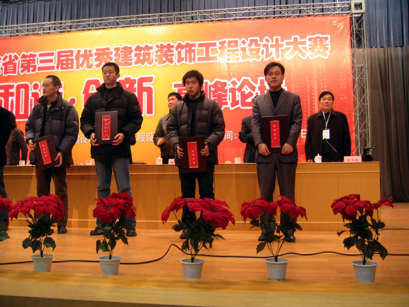 山东省第三届优秀建筑装饰工程设计大赛由山东省建设厅主办,共收到申报项目184项,其中装饰工程类21项,装饰方案类57项,装饰表现类106项。经组织专家评审和投票表决,共评出一等奖9项,二等奖30项,三等奖54项;4名设计师获得“设计之星”称号,5名在校学生获得“希望之星”称号,5名教师获得优秀指导教师称号。