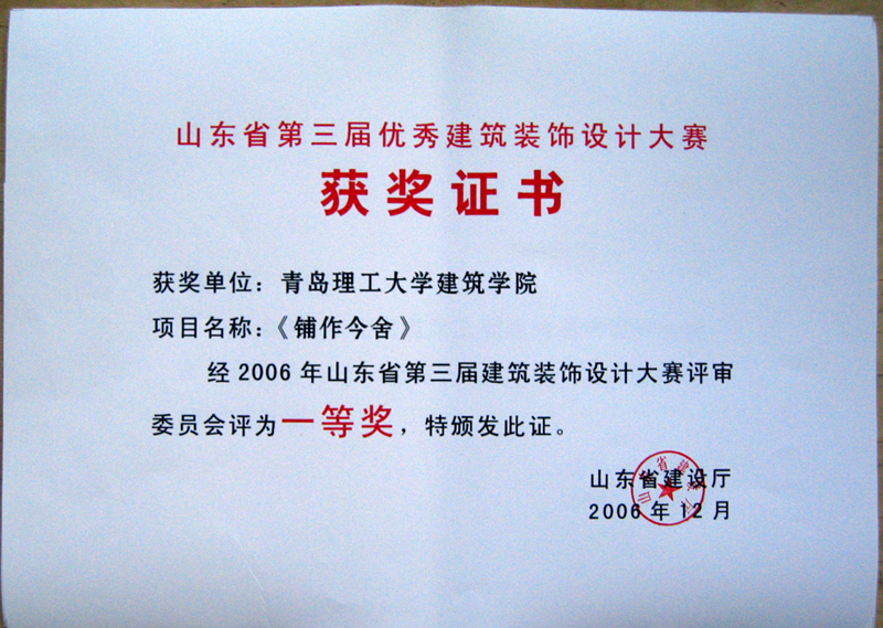 1月9日,山东省第三届优秀建筑装饰工程设计大赛颁奖大会在济南召开,永利官网建筑学院共有8件作品获奖,徐磊同学获得“希望之星”称号,李承来获得优秀指导教师称号。