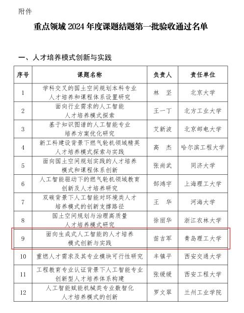 近日,教育部重点领域教学资源建设项目管理办公室发布2024年建设课程验收结果,副校长苗吉军牵头完成的课题《面向生成式人工智能的人才培养模式创新与实践》顺利验收通过。