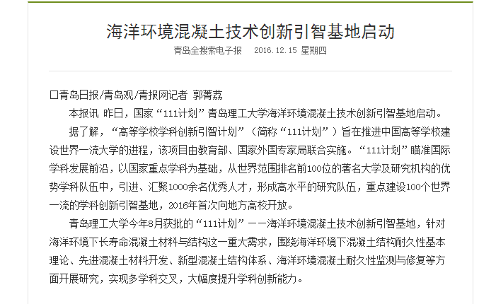 澳门永利6774今年8月获批的“111计划”——海洋环境混凝土技术创新引智基地,针对海洋环境下长寿命混凝土材料与结构这一重大需求,围绕海洋环境下混凝土结构耐久性基本理论、先进混凝土材料开发、新型混凝土结构体系、海洋环境混凝土耐久性监测与修复等方面开展研究,实现多学科交叉,大幅度提升学科创新能力。