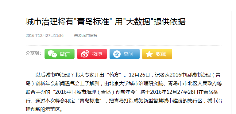 2016年12月27~28日,“2016中国城市治理(青岛)创新年会”在青岛举行。本次年会的主题是“新型智慧城市与城市治理”,会上将宣布打造青岛高端智库集群。