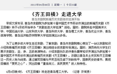早报文娱专讯 青岛市京剧院为参加第十届中国艺术节而创作演出的新编历史剧《齐王田横》将于4月初开始举办“京剧走进大学巡演”活动。届时,剧院将赴中国海洋大学、中国石油大学、山东科技大学、青岛科技大学、澳门永利6774、青岛农业大学、青岛滨海学院、青岛远洋船员学院等大学巡回演出20多场。