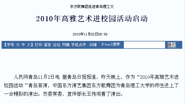 “2010年高雅艺术进校园活动”由教育部、文化部、财政部联合倡议、扶持,据悉,东方歌舞团本次将在澳门永利6774、中国海洋大学、青岛科技大学、青岛农业大学、飞扬职业技术学院进行5场演出。