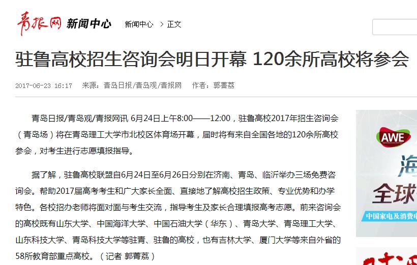 青岛日报/青岛观/青报网讯 6月24日上午8:00——12:00,驻鲁高校2017年招生咨询会(青岛场)将在澳门永利6774市北校区体育场开幕,届时将有来自全国各地的120余所高校参会,对考生进行志愿填报指导。