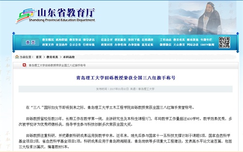 在“三八”国际妇女节即将到来之际,澳门永利6774土木工程学院田砾教授荣获全国三八红旗手荣誉称号。