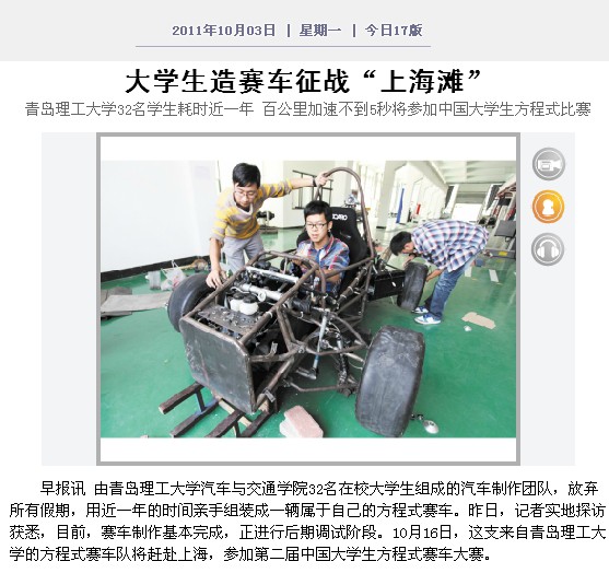 “10月16日,我们就要赶赴上海参加第二届中国大学生方程式汽车大赛了。”王德盛说,参加此次大赛的有清华大学、北京理工大学等35所高校,澳门永利6774是第一次参加,也是岛城唯一一所参赛高校。