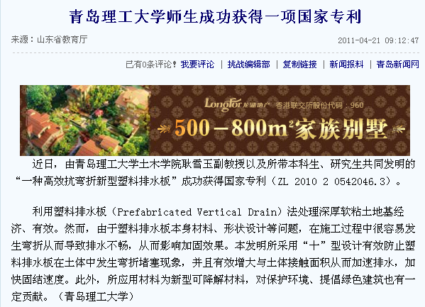 近日,由澳门永利6774土木学院耿雪玉副教授以及所带本科生、研究生共同发明的“一种高效抗弯折新型塑料排水板”成功获得国家专利(ZL 2010 2 0542046.3)。