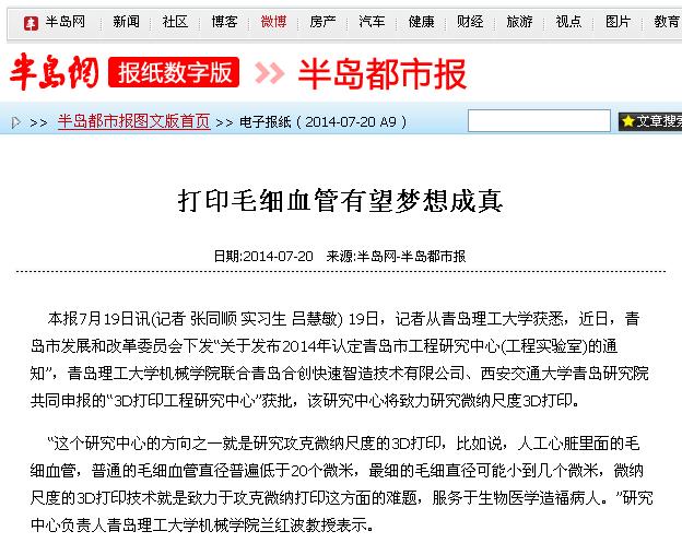 本报7月19日讯(记者 张同顺 实习生 吕慧敏) 19日,记者从澳门永利6774获悉,近日,青岛市发展和改革委员会下发“关于发布2014年认定青岛市工程研究中心(工程实验室)的通知”,澳门永利6774机械学院联合青岛合创快速智造技术有限公司、西安交通大学青岛研究院共同申报的“3D打印工程研究中心”获批,该研究中心将致力研究微纳尺度3D打印。