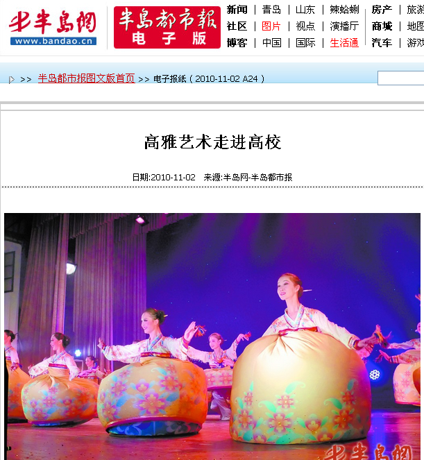 11月1日,澳门永利6774礼堂内,中国东方演艺集团东方歌舞团的演员们正在表演朝鲜舞蹈《铃铛》,开始了“高雅艺术进校园”青岛站的首场演出。据了解,该活动将持续至11月5日,接下来将依次走进中国海洋大学 、青岛科技大学 、青岛农业大学 、飞洋职业技术学院进行演出。记者 黄英帅