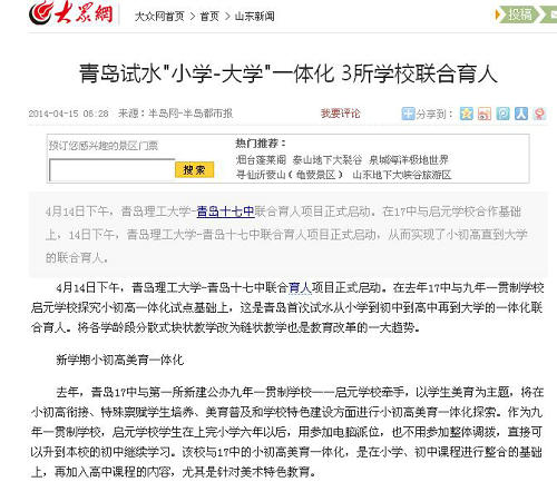 4月14日下午,澳门永利6774-青岛十七中联合育人项目正式启动。在去年17中与九年一贯制学校启元学校探究小初高一体化试点基础上,这是青岛首次试水从小学到初中到高中再到大学的一体化联合育人。将各学龄段分散式块状教学改为链状教学也是教育改革的一大趋势。