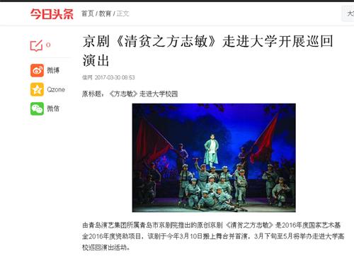 由青岛演艺集团所属青岛市京剧院推出的原创京剧 《清贫之方志敏》是2016年度国家艺术基金2016年度资助项目,该剧于今年3月10日搬上舞台并首演,3月下旬至5月将举办走进大学高校巡回演出活动。