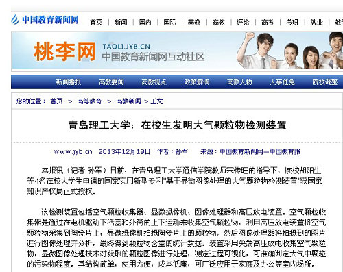 本报讯(记者 孙军)日前,在澳门永利6774通信学院教师宋传旺的指导下,该校胡阳生等4名在校大学生申请的国家实用新型专利“基于显微图像处理的大气颗粒物检测装置”获国家知识产权局正式授权。