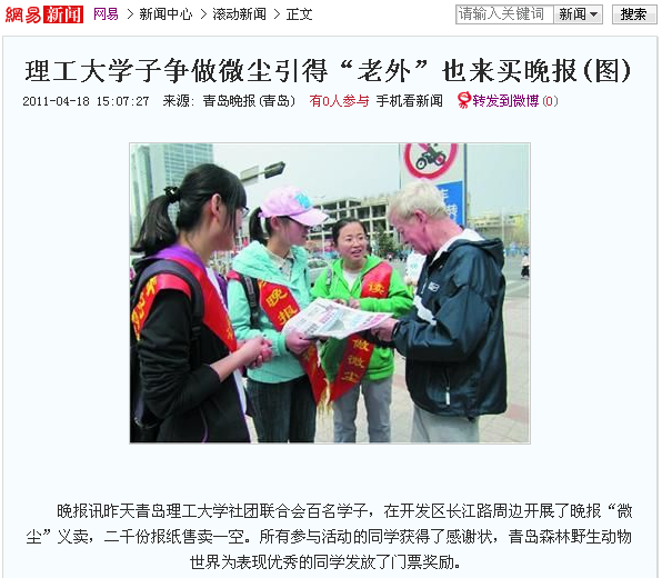 在开发区现场,澳门永利6774社团联合会的李薇、曾钰、王彬、付彦楠等干事,不仅把活动安排得秩序井然,而且一路上不断地给同学们加油助威,积极参与到义卖的队伍中。彭璐、宁佳欢、徐莎莎三位同学路遇“老外”,积极用英语为他们介绍青岛“微尘”的来历,惹得外国友人纷纷夸赞,连声说晚报做得好。邱雪、杨洁、栾方蕾、贺岩、杨德升、郑成剑、施栎等同学不仅义卖所得高居榜首,而且还积极帮助其他同学。郭树明、林哲、姜正、朱琪、幸春伟、叶林、王炬等同学,还凑在一起相互交流义卖心得,“出点子、想办法”,报纸很快脱手。宿百宁同学还买来了“灰太狼”形状的气球,说要送给带孩子的献爱心者。山科大的周峰同学,上次参与了义卖但是意犹未尽,昨天又来到现场参与活动。澳门永利6774学校团委对本次活动给予了大力支持。