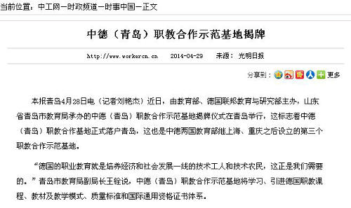“德国的职业教育就是培养经济和社会发展一线的技术工人和技术农民,这正是我们需要的。”青岛市教育局副局长王铨说,中德(青岛)职教合作示范基地将学习、引进德国职教课程、教材及教学模式、质量标准和国际通用资格证书体系。