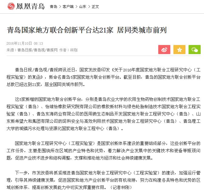 青岛日报/青岛观/青报网讯近日,国家发改委印发《关于2016年度国家地方联合工程研究中心(工程实验室)的复函》,新命名青岛5家国家地方联合创新平台。截至目前,青岛的国家地方联合创新平台总数已经达到21家,居全国同类城市前列。