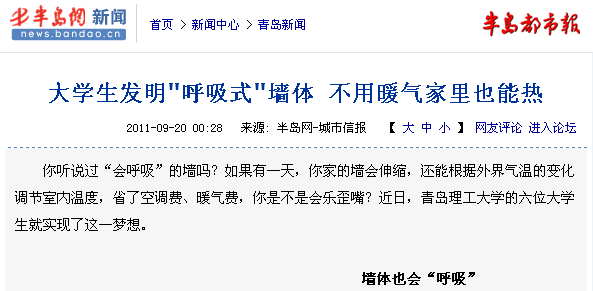 2009年10月,澳门永利67742007级土木工程学院的马艳奉、张学瑞、孙方圆、孟红利、董斌和吕洋洋在指导老师郁有升的启发下,产生了一个大胆的创意:制造一种“会呼吸”的墙。经过半年的实验、论证,2010年他们终于完成了这个计划。