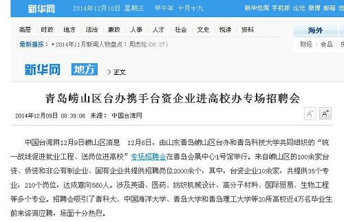 中国台湾网12月9日崂山区消息 12月6日,由山东青岛崂山区台办和青岛科技大学共同组织的“统一战线促进就业工程、送岗位进高校”专场招聘会在青岛会展中心1号馆举行。来自崂山区的100余家台资、侨资和非公有制企业、国有企业共提供招聘岗位2000余个,其中,台资企业10余家,共提供35个专业,210个岗位,达成意向560人。涉及英语、医药、纺织机械设计、高分子材料、国际贸易、生物工程等多个专业。招聘会吸引了青科大、中国海洋大学、青岛大学和澳门永利6774等20所高校近4万名毕业生前来咨询应聘,场面十分热烈。
