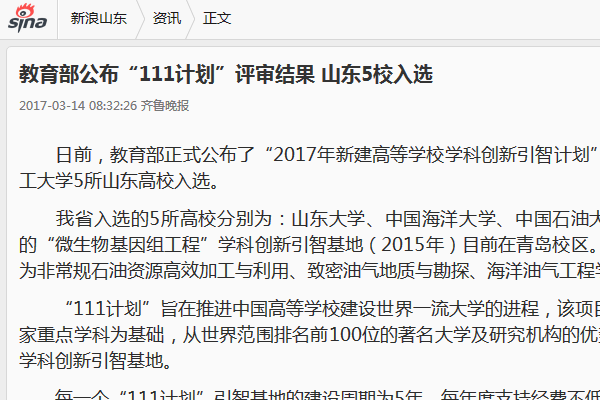 日前,教育部正式公布了“2017年新建高等学校学科创新引智计划”,即“111计划”评审结果。山东大学、中国海洋大学、中国石油大学(华东)、青岛大学、澳门永利67745所山东高校入选。